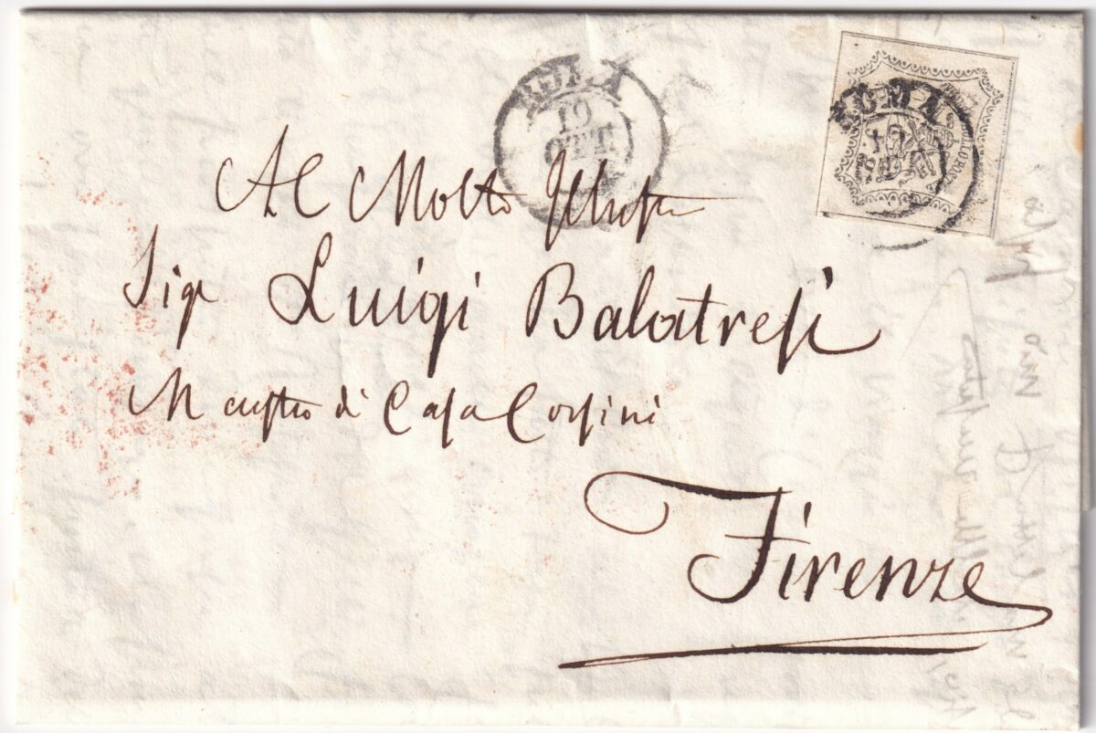 1854 28 Gen 8 b. grigio oleoso isolato Sass 9a su sovr. da Roma x Firenze Cv 1125