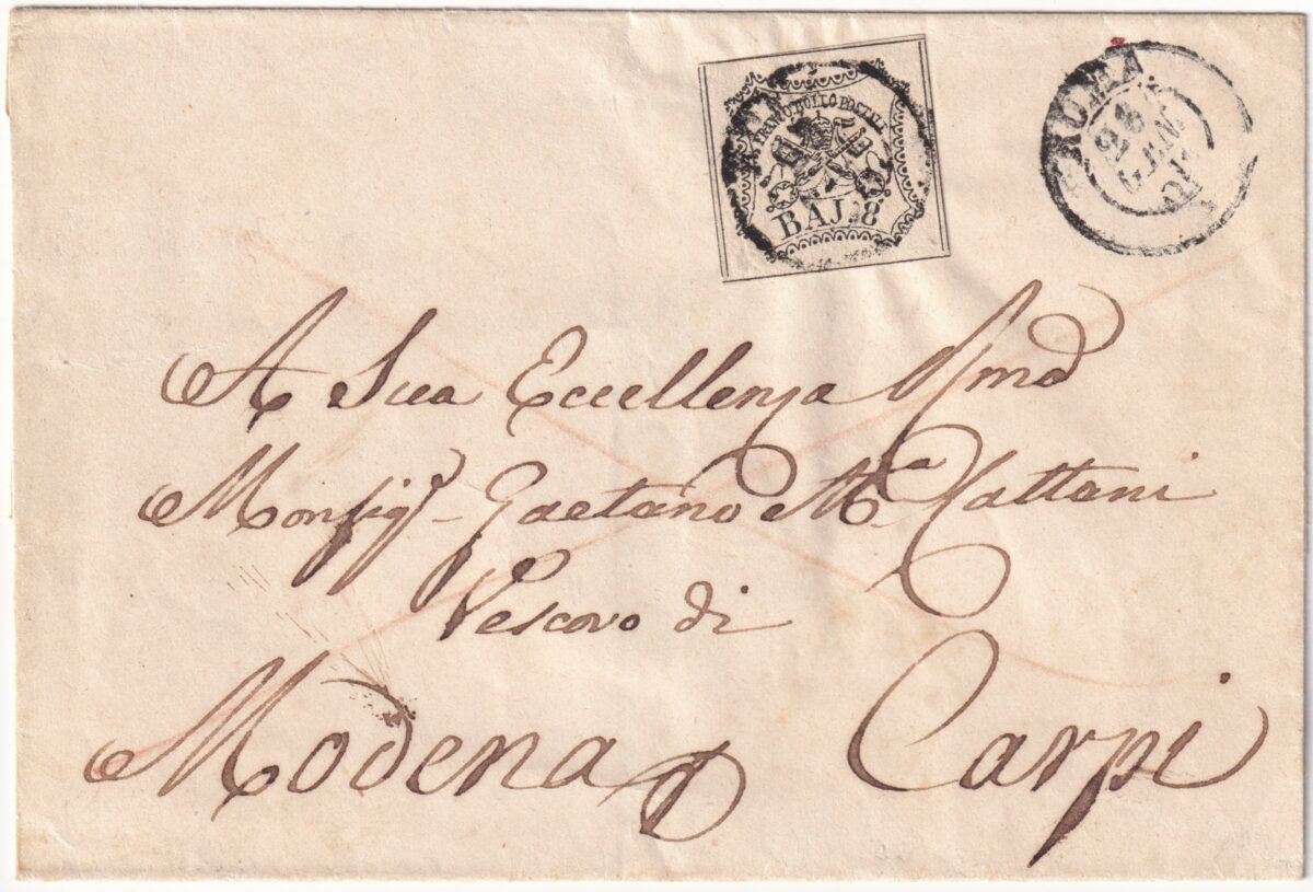 1854 28 Gen 8 b.isolato Sass 9 su sovr. da Roma x III^ Distanza oltre le 20 leghe x DUcato di Modena a Carpi