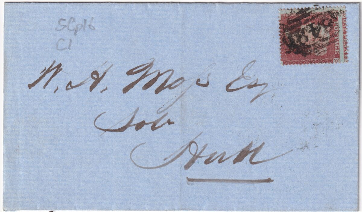 1854 7 Ago 1 p. Dent. Spsot. ONE PENNY in alto invece che in basso su bustina Cert.Bolaffi