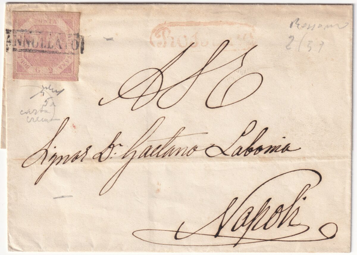 1858 14 Feb 2 gr. Carta Crema Senza Filigrana Sass 5a/v su sovr. da Rossano x Napoli f.Chiav. Spl
