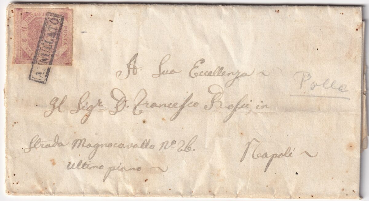HomeStoria PostaleAntichi StatiNapoli1858 14 Feb 2 gr. Senza Filigrana Sass 5d/5v ben marginato su lettera da Polla Pt.8 x Napoli Cv 1200