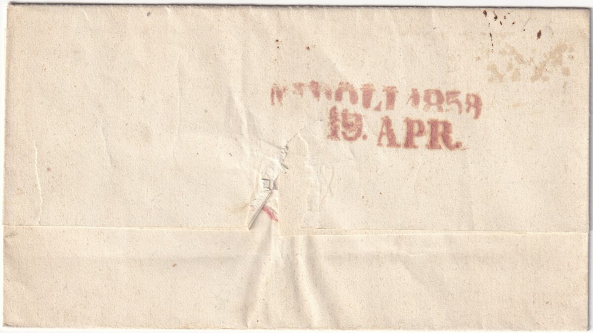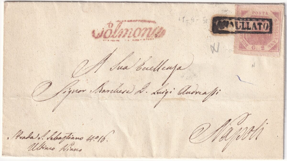 HomeStoria PostaleAntichi StatiNapoli1858 18 Apr 2 gr. Sass 7c ben marginato su sovr. da Solmona x Napoli Spl
