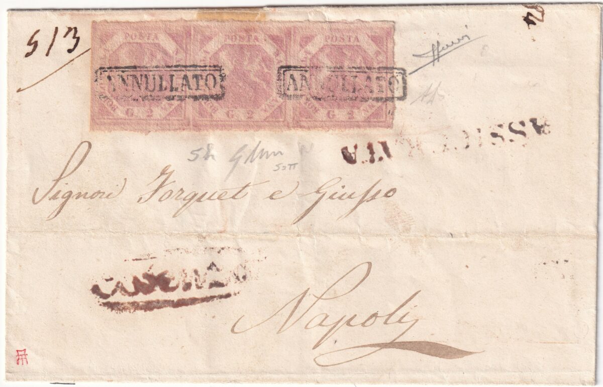 1858 27 Sett 2 gr. Carta Sottile striscia di 3 Sass 5h su assicurata da Cosenza x Napoli f. AD, Sorani rarissima