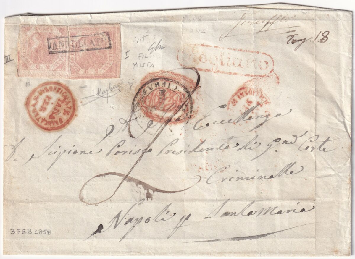 1858 3 Feb Mista 2 gr. I^ Tav. + 2 gr. III^ tav. Sass 5+7 su busta da Rogliano x S.Maria Tassa e Cifra Insuff. f. Ray RR
