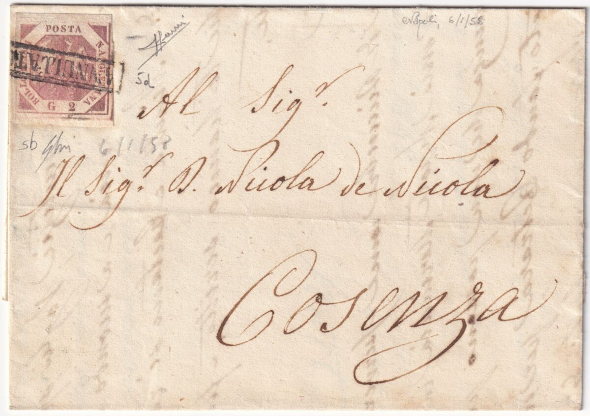 HomeStoria PostaleAntichi StatiNapoli1858 6 Genn 2 gr. senza filigrana Sass 5b/v su lettera da Napoli x Cosenza f.Sorani Cv 8000