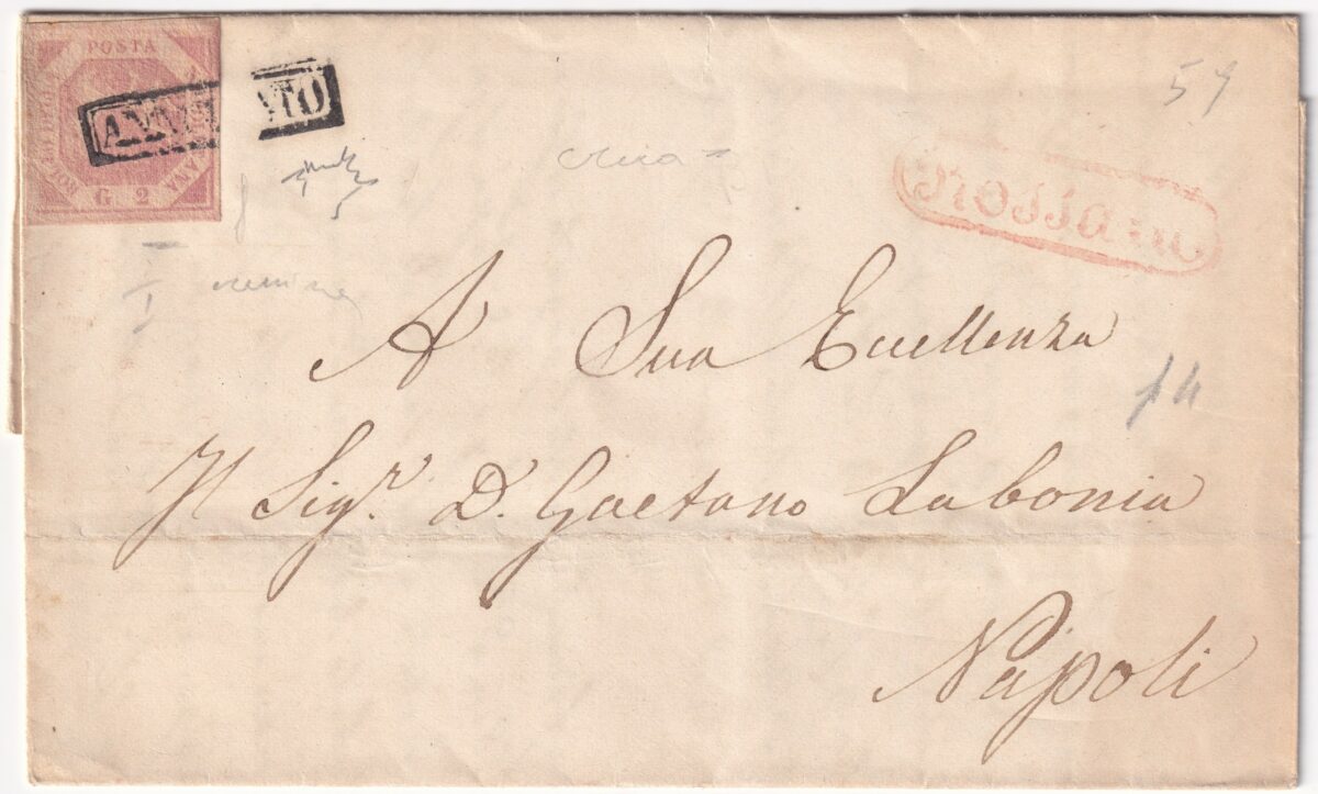 HomeStoria PostaleAntichi StatiNapoli1858 7 Apr 2 gr. carta Crema Sass 5a ben marginato su sovr. da Rossano x Napoli f. Sass. Chiav