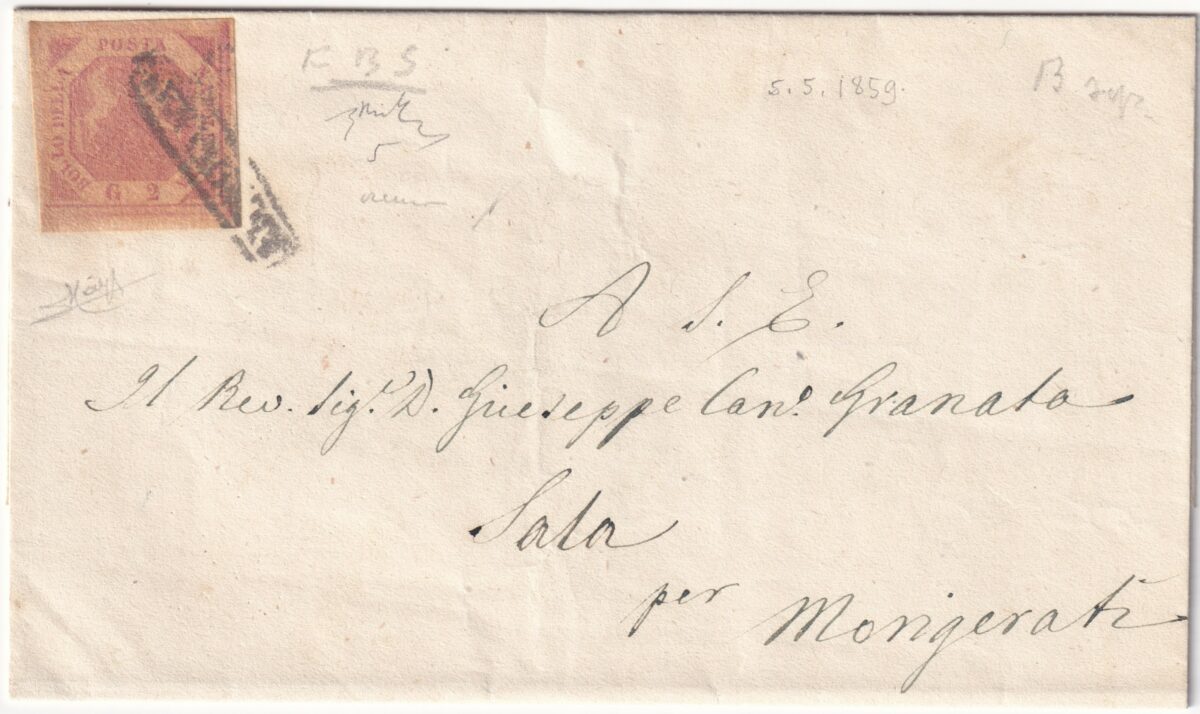 1859 5 Mag 2 gr. Carta Crema Sass 5a ben marginato su sovr. da Napoli x Mongerati f.Ray Spl