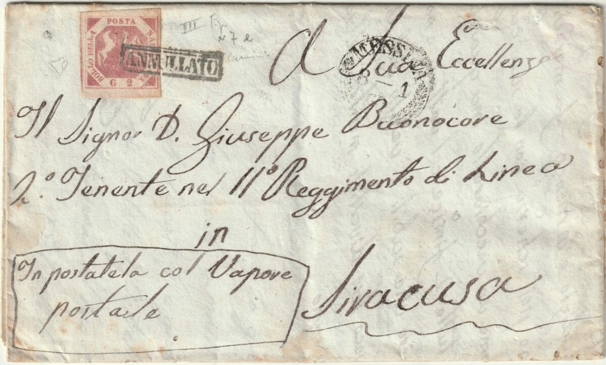 1860 1 Gen 2 gr. Sass. 7e isolarto su lettera Via di Mare impostata sul battello da Napoli x Siracusa xmilitare firma ED