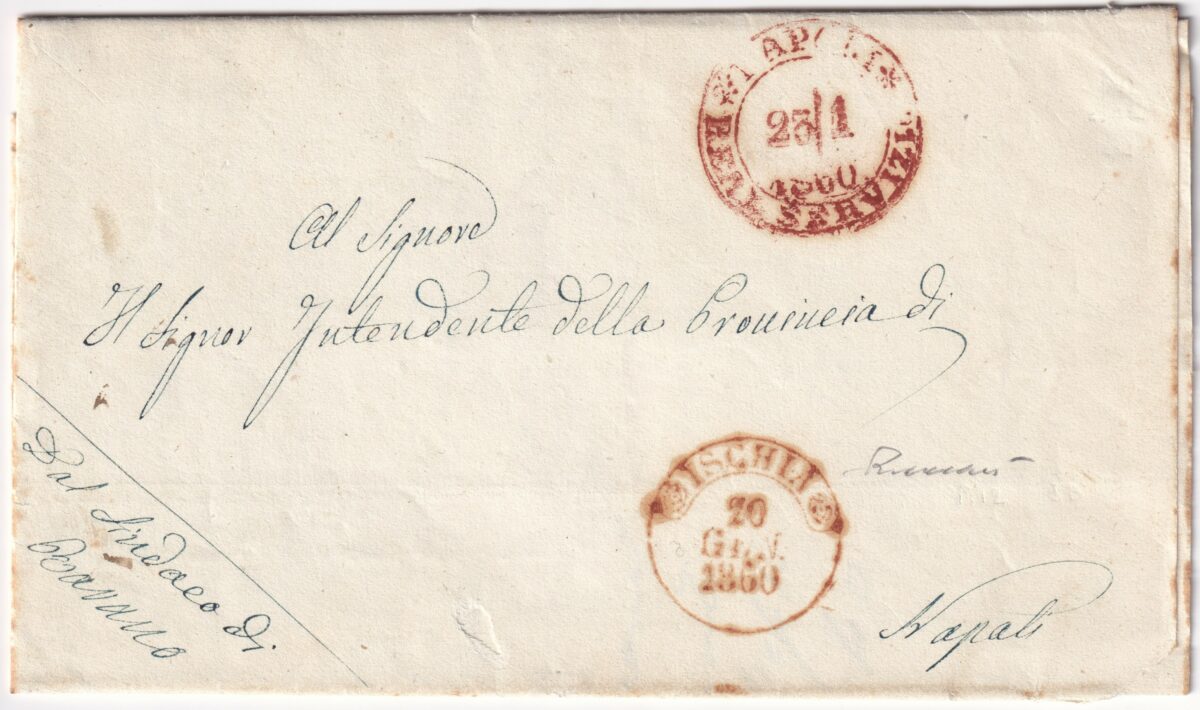 1860 20 Gen lettera da Ischia di Real Servizio x Napoli f. Vaccari rara