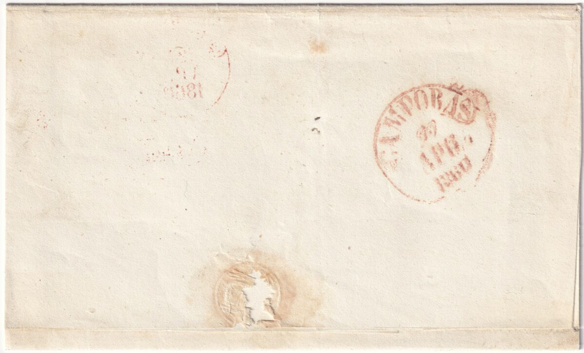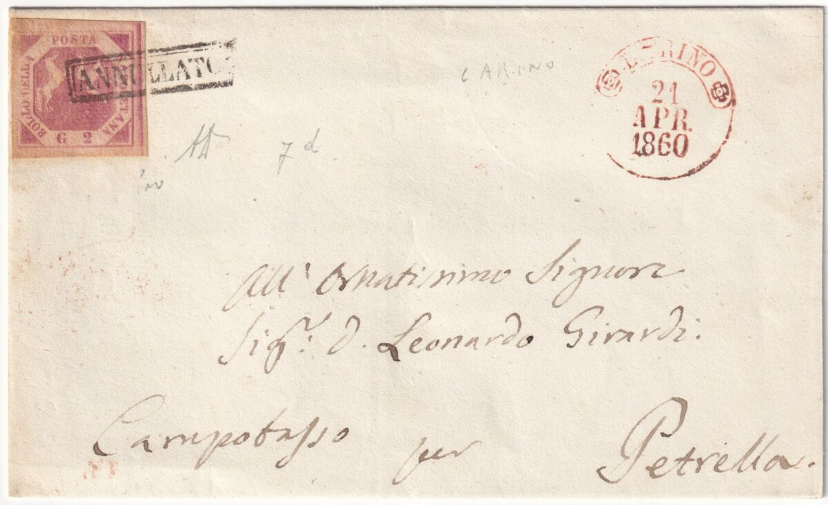 HomeStoria PostaleAntichi StatiNapoli1860 21 Apr 2 gr. Sass 7d ben marginato su sovr. da Larino Pt.5 x Petrella f.AD Spl