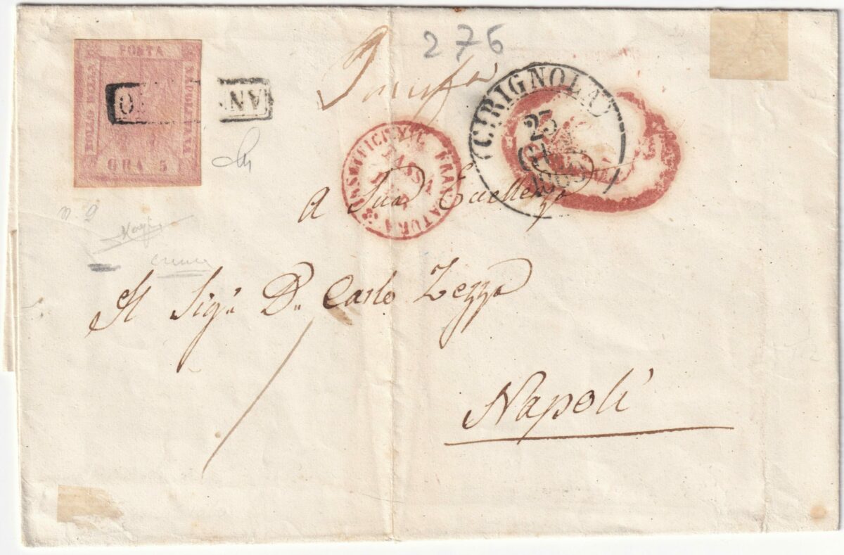 1858/60 – Cirignola Annulli Verde cerchio-Ann. Pt.7 + ovale-Ann. Pt.6 su 2 missive x Napoli pluriperiziate – Sassone n.5