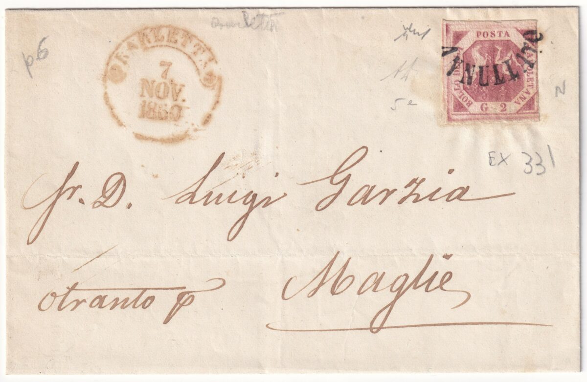 1860 7 Nov Dittatura 2 gr. Sass 5e su sovr. da Barletta Svolazzo Pt.6 x Napoli f. Chiav., AD Spl