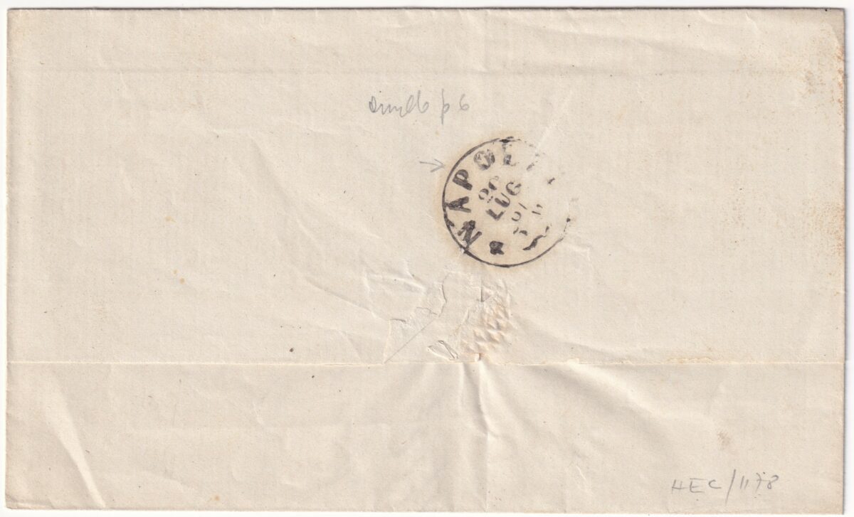 HomeStoria PostaleAntichi StatiProvince Napoletane1861 17 Lug 2 gr. Sass 20d su fresca sovr. da Lecce Svolazzo Pt.8 x Napoli f. Ray, Chiav. Spl