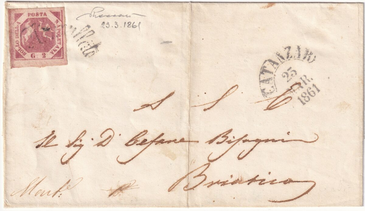 1861 23 Apr 2 gr. Sass 7g su fresca sovr. da Catanzaro Svolazzo Pt.8 x Briartico f.Vacc. Spl