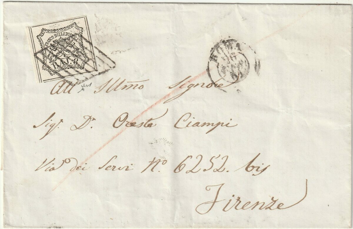HomeStoria PostaleAntichi StatiPontificio1861 26 Mar 8 b. Sass.9 ben marginato msu sovr. da Roma x Firenze Spl