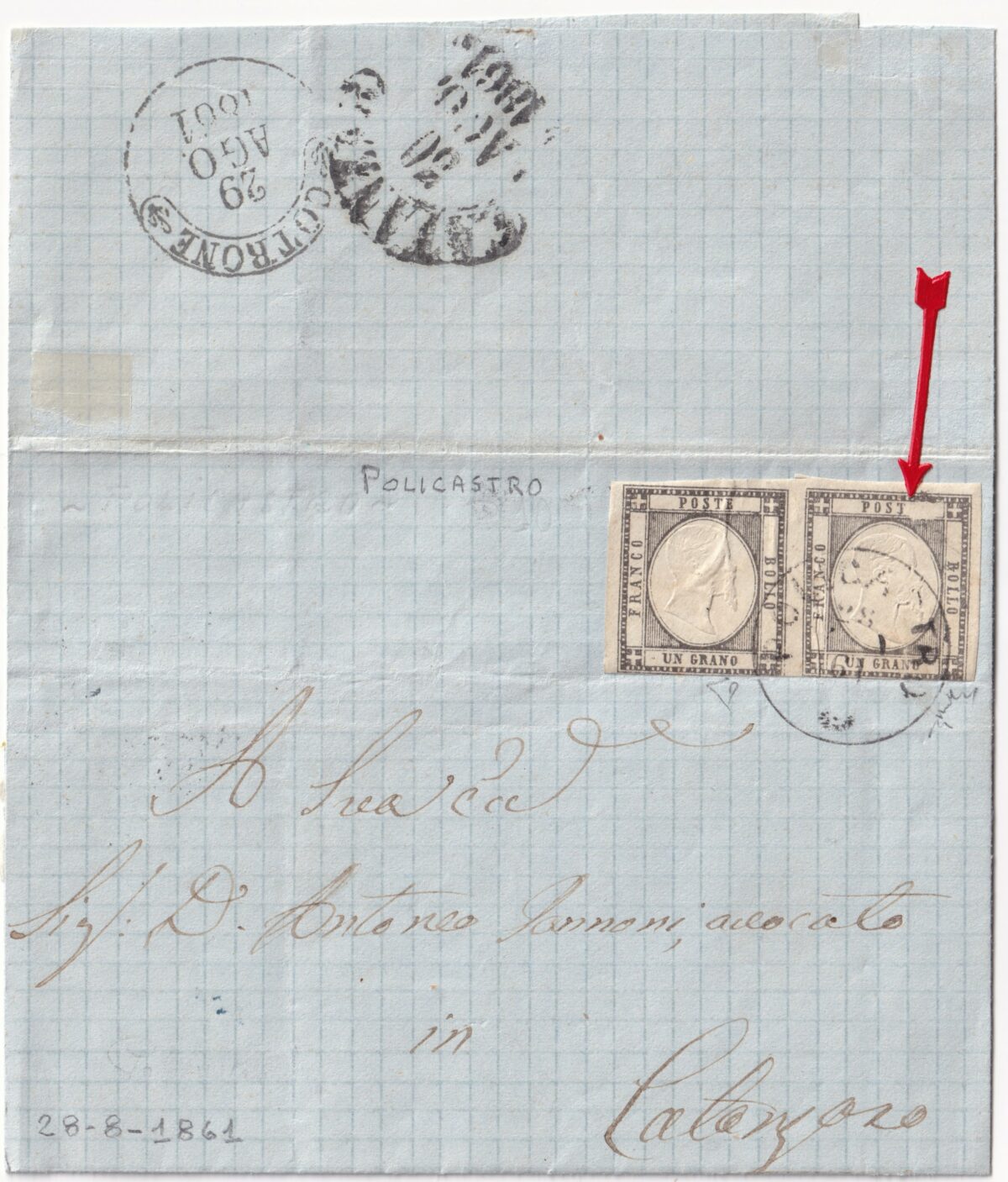 HomeStoria PostaleAntichi StatiProvince Napoletane1861 28 Ago 1 gr. coppia con Varietà Senza E Sass 19a su fresca sovr.da Policastro cerchio Non Ripeturo f.Ed, Chiav