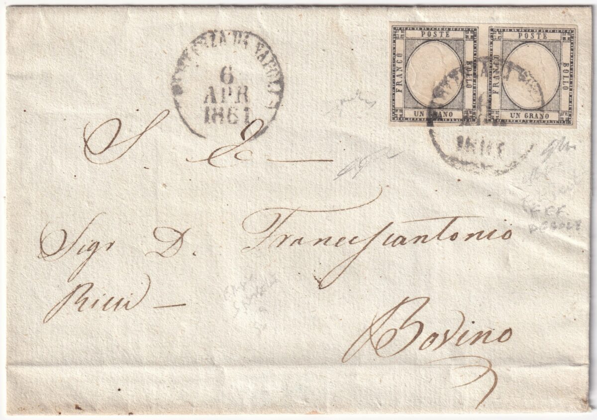 1861 6 Apr 1 gr. coppia Effigi Deboli Sass 19a su sovr. da Napoli x Bovino f. Chiav.