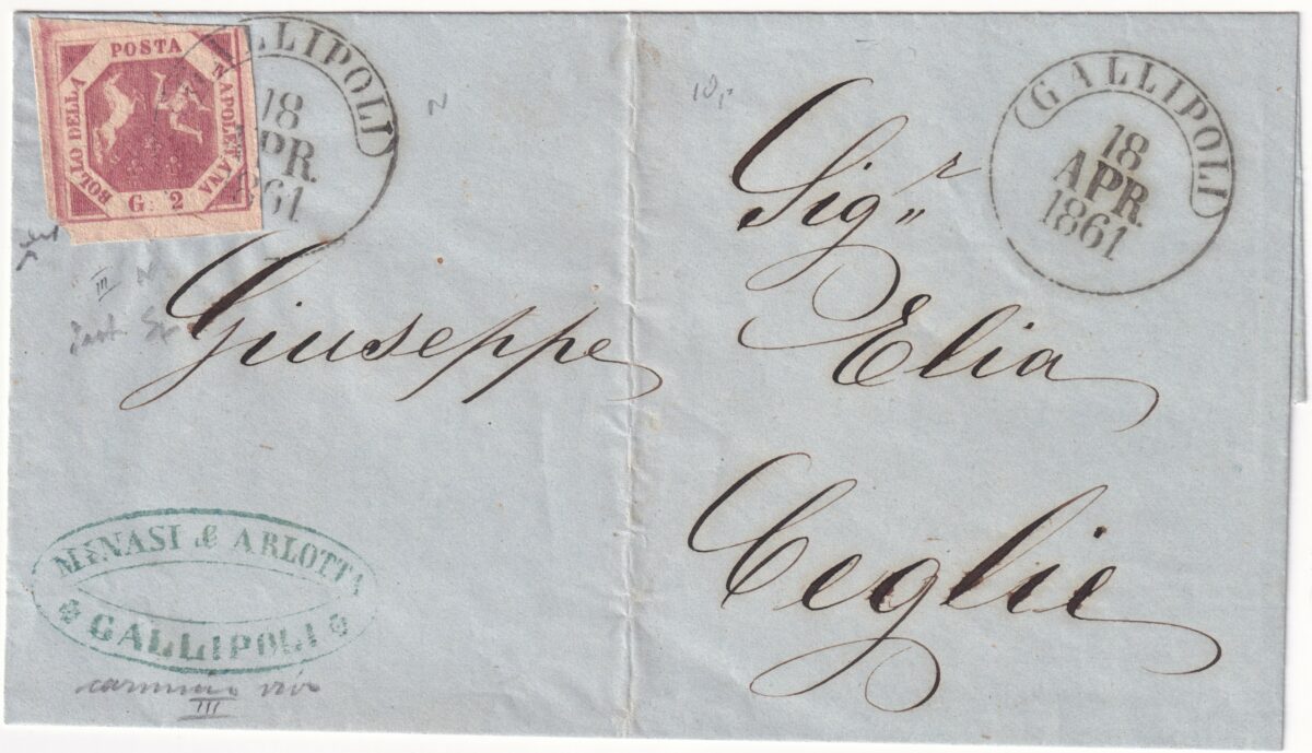 2 gr. + 2 gr. tinte diverse Doppia Effige ampi margini su sovr. da Napoli x Gallipoli rara pluriperi – Sassone n.20 Dopp