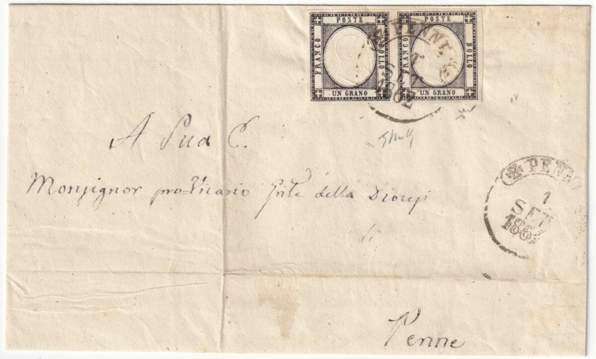 HomeStoria PostaleAntichi StatiProvince Napoletane1862 1 Set Nov Province Napoletane 1 gr. coppia Sass 19c ampi margini su sovr. da Penne x città doppio porto Rarissima
