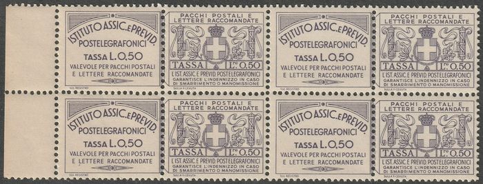 1936 – Postelegrafonici Serie di 3 valori da 50 c. + 1 l. + 1,50 l. in Quartine integre molto rara – Sassone nn.12/13+17
