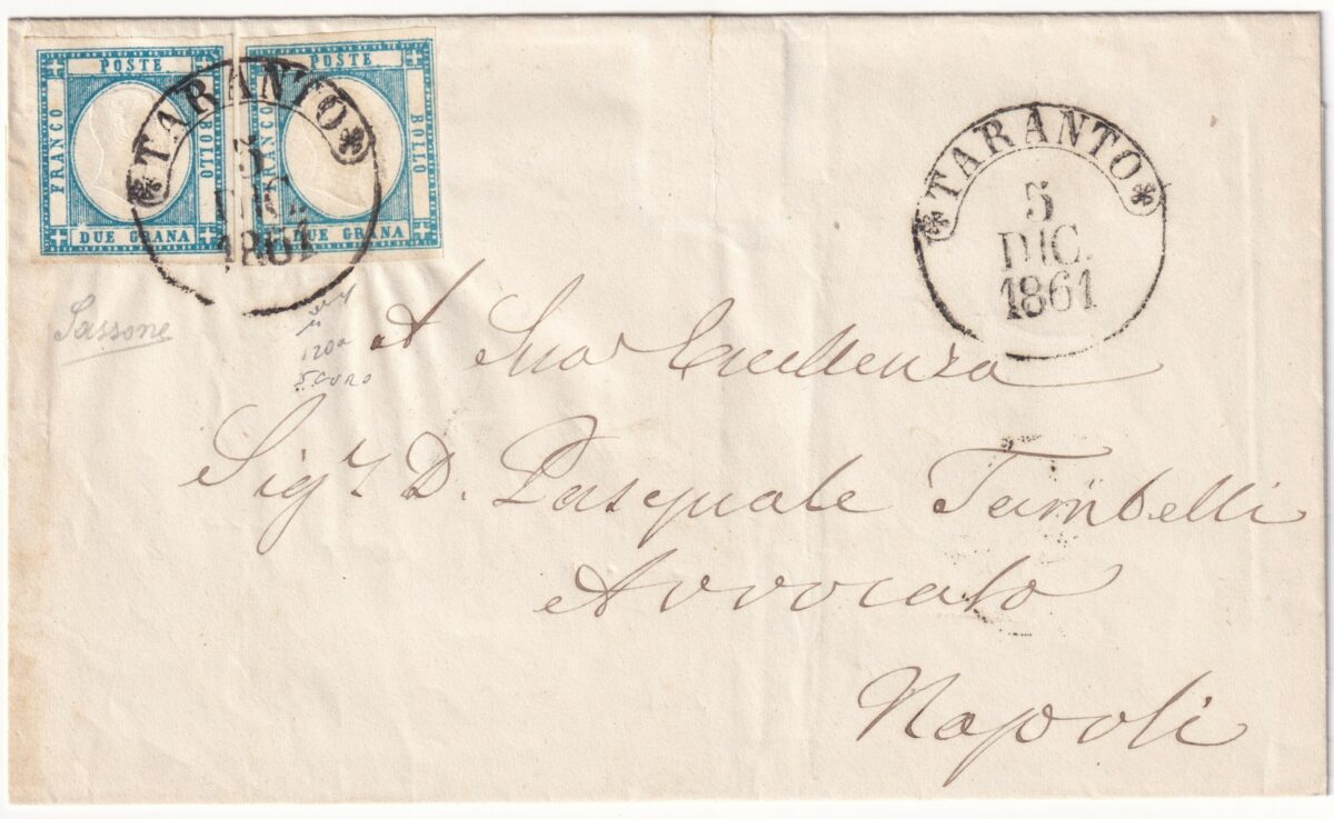 Province Napoletane 1861 – 1 gr. coppia ampi margini su sovracorperta da Giovinazzo Pt.3 x Napoli periziata – Sassone n.