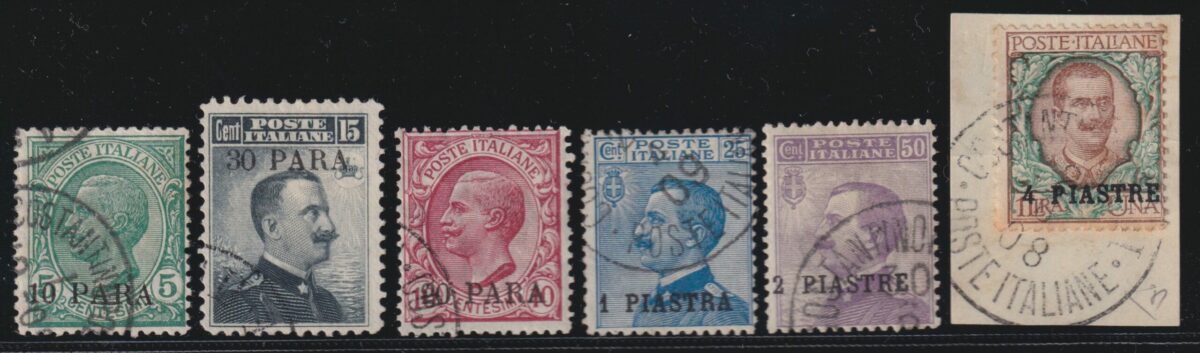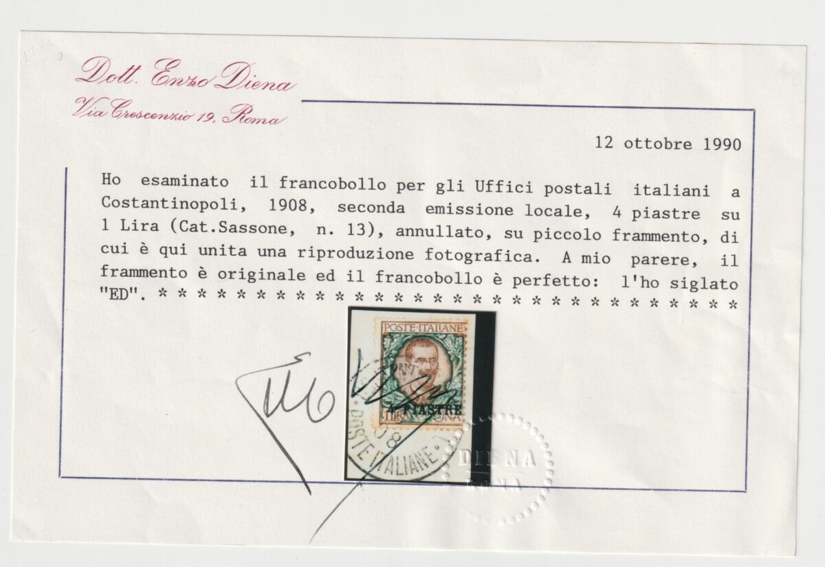 HomeFrancobolliEsteroAsiaCostantinopoli 1908 Serie di 5 valori Sass. 8/13 Usati Cv. 3650 Certificati Diena firmati Ray