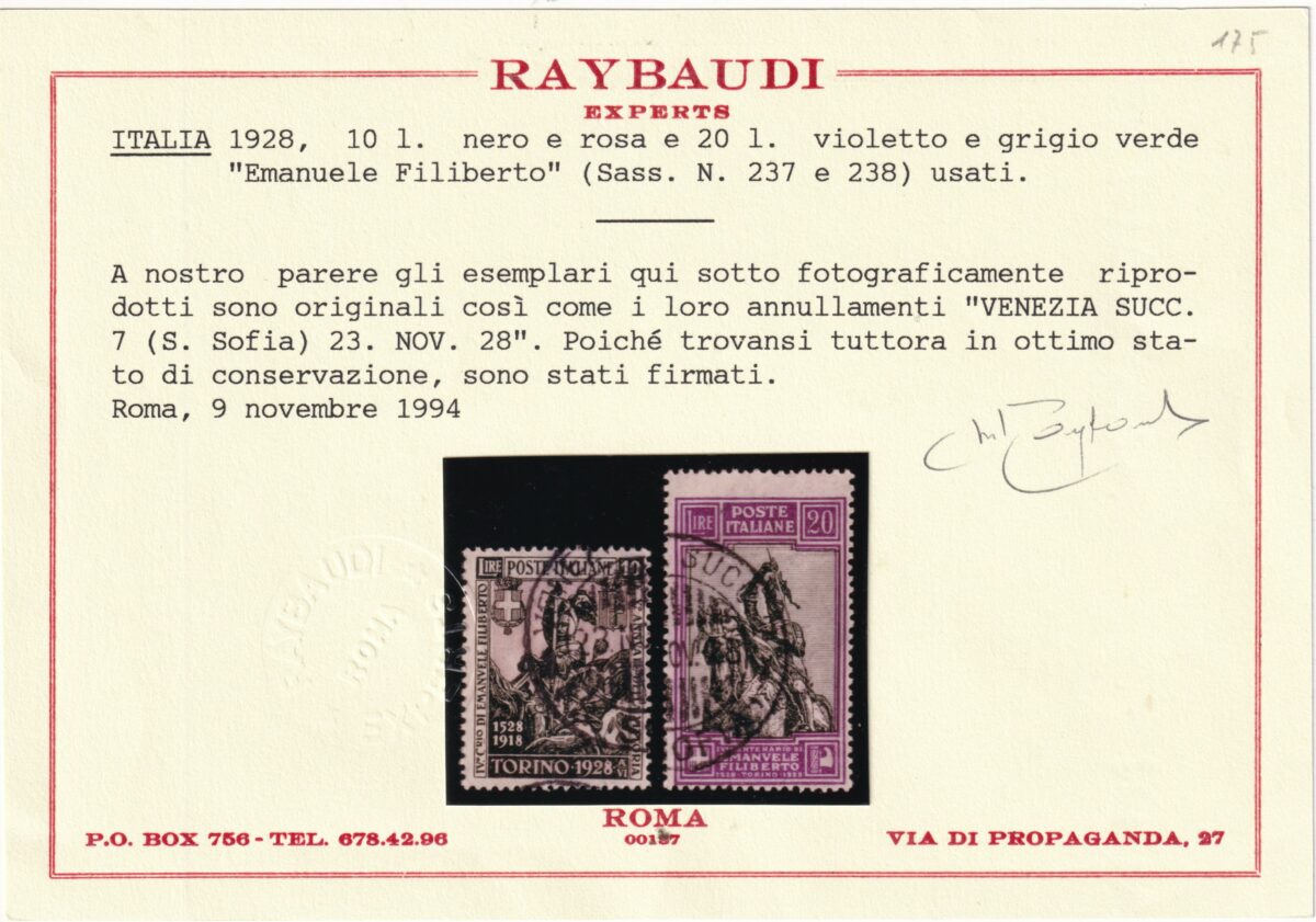 HomeFrancobolliRegnoRegno d'ItaliaEm. Filiberto Serie Completa di 13 valori Sass S.48 usata Cert.Raybaudi Spl Cv 2000