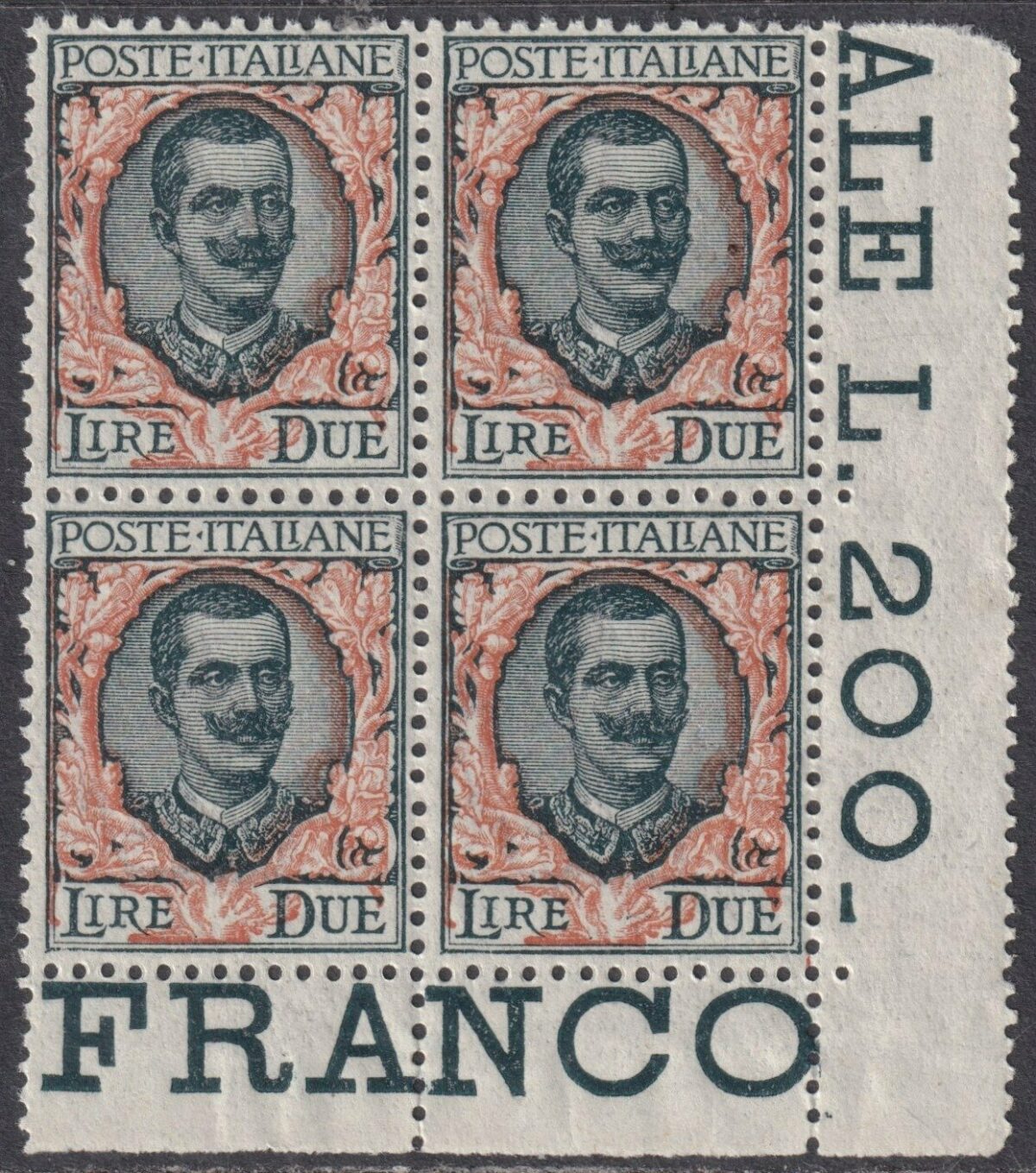 HomeFrancobolliRegnoRegno d'ItaliaFloreale 2 l. verde grigio e arancio Quartina Adf centrata integra rara lusso – Sassone n.150