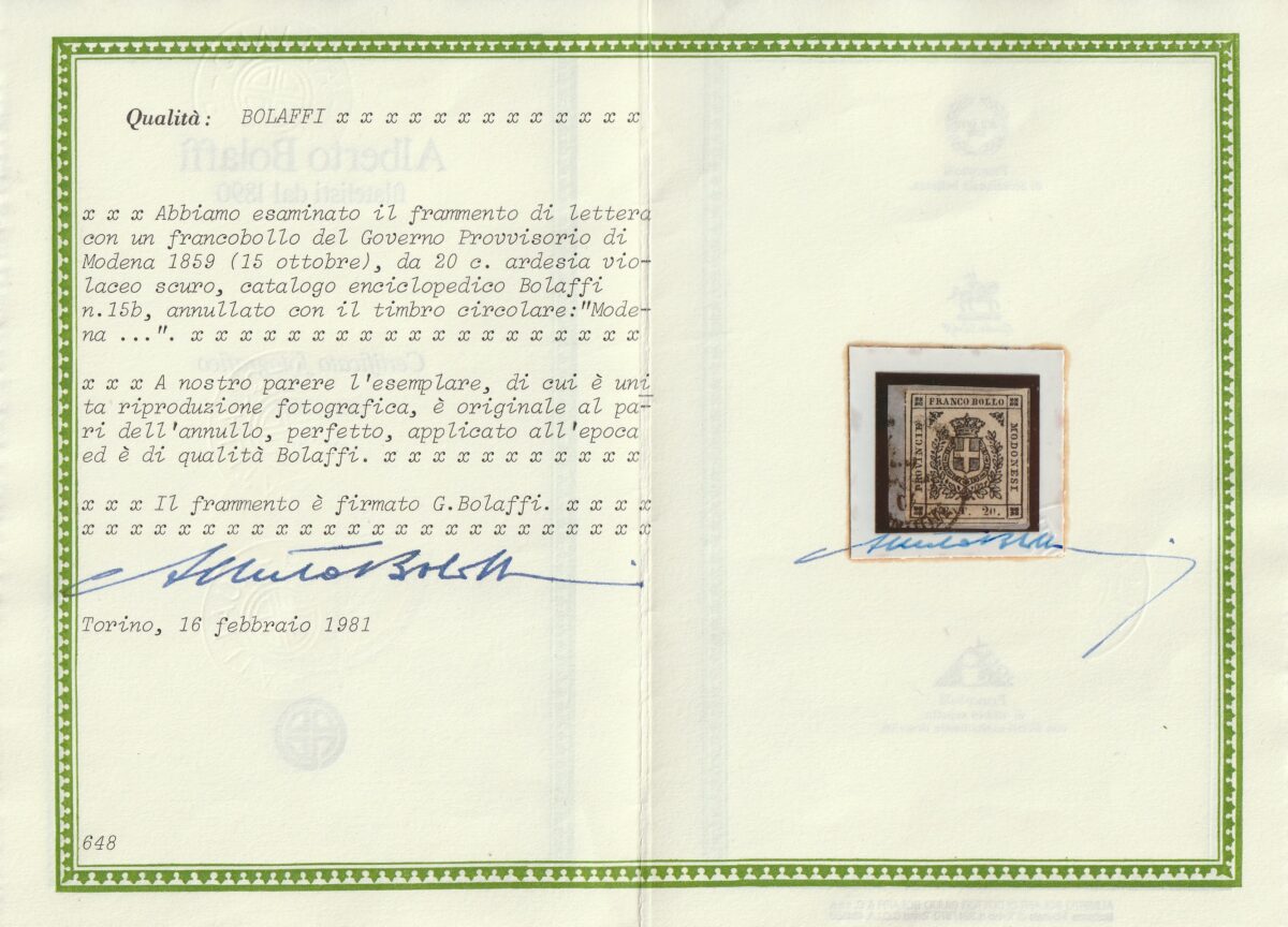 Governo Provv. 20 c. nero violaceo Sass 15b usato grandi margini f.Giulio Bolaffi Cert. Bolaffi 100% Lusso Cv 1450