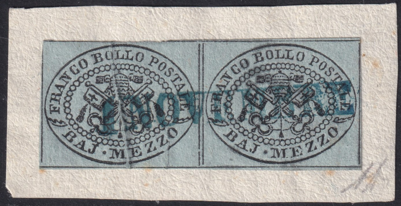 I^ Em. 1/2 b. grigio azzurro coppia Sass 1a ben marginata usata su framm. annullo a data azzurro f.AD Spl
