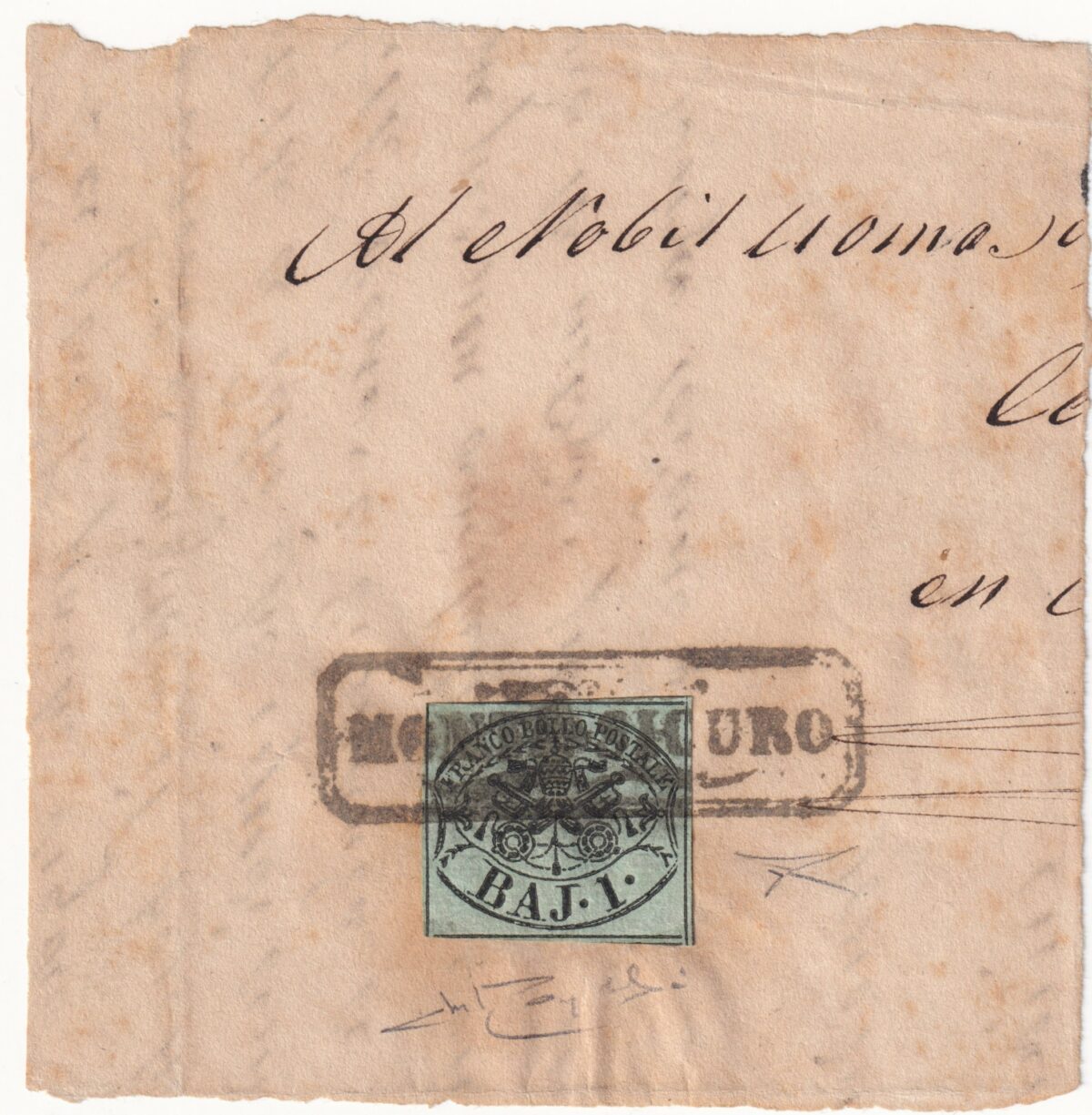 HomeStoria PostaleAntichi StatiPontificioI Em. 1 b. Sass 2 ben filettato usato su frammento Montesicuro Pt.R3 f. Ray, Bott Rarità Cv 7000