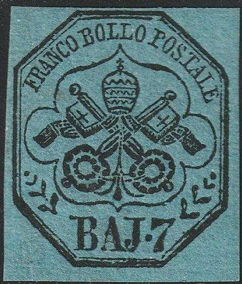 HomeFrancobolliAntichi StatiPontificioI^ Em. 7 b. azzurro ben marginato nuovo con gomma molto raro pluriperiziato – Sassone n.8