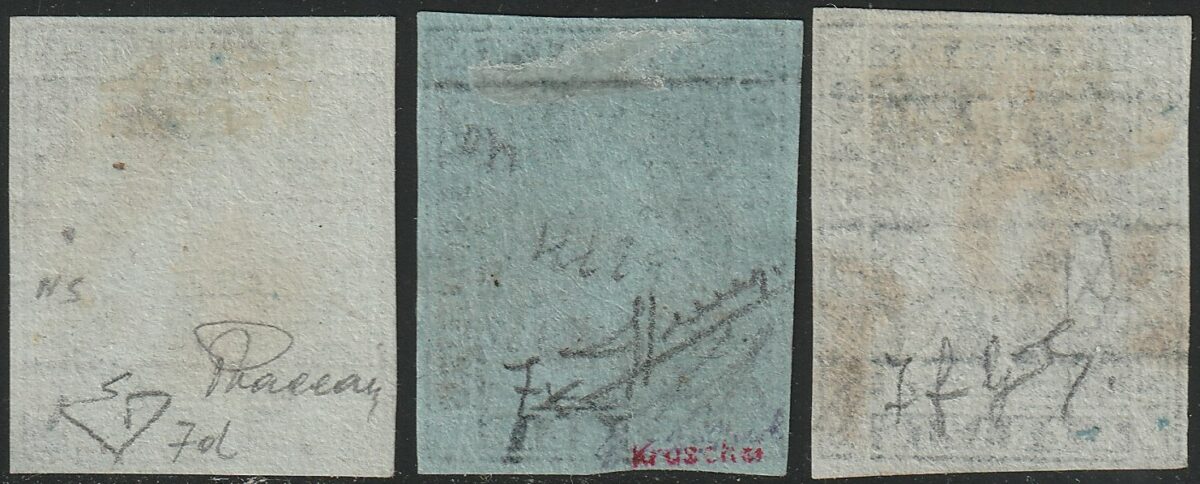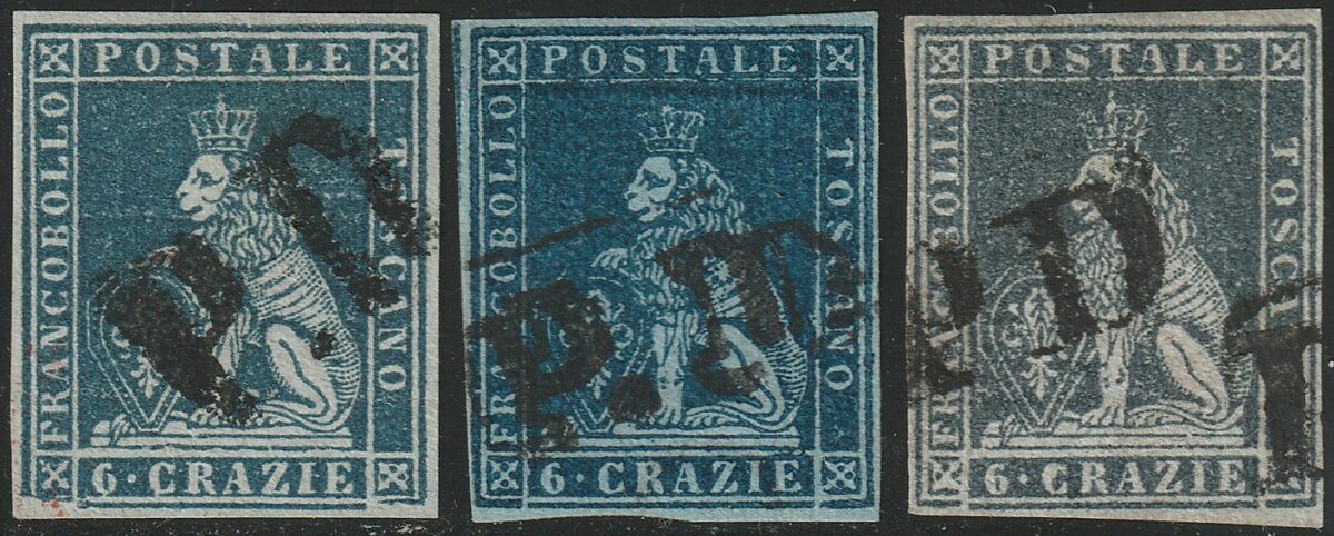I^ Em. Serie di 3 valori di tinte diverse del 6 cr. Sass 7+7a+7d usati grandi margini tutti annullo PD lusso