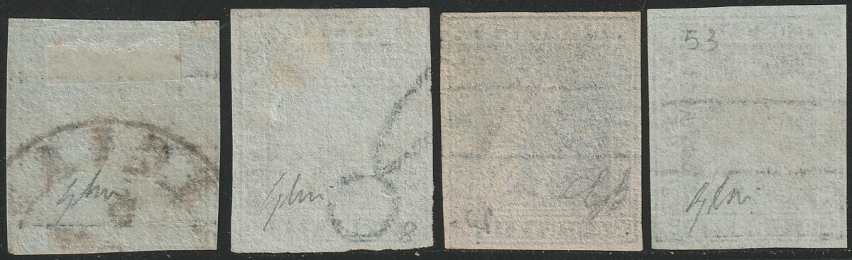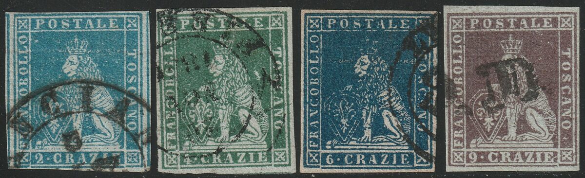 HomeFrancobolliAntichi StatiToscanaI^ Em. Serie di 4 valori dal 2 cr. al 9 cr. Sass 5d/8 usati grandi margini lusso