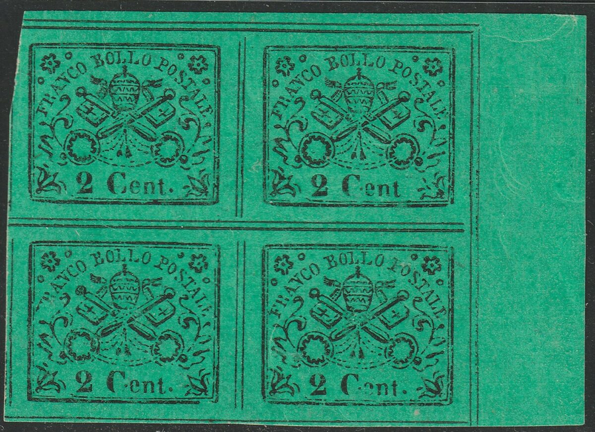 HomeFrancobolliAntichi StatiPontificioII^ Em. 2 c. Quartina Sass 18a MNH**/MLH* Bdf f.Ray, Chiav Cv 1500