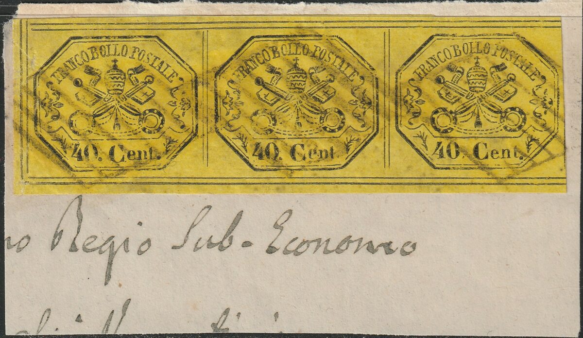 HomeFrancobolliAntichi StatiPontificioII^ Em. 40 c. Sass 19 striscia di 3 con 2 es. con 8 Filetti Adf lusso rarissima Cv 15000