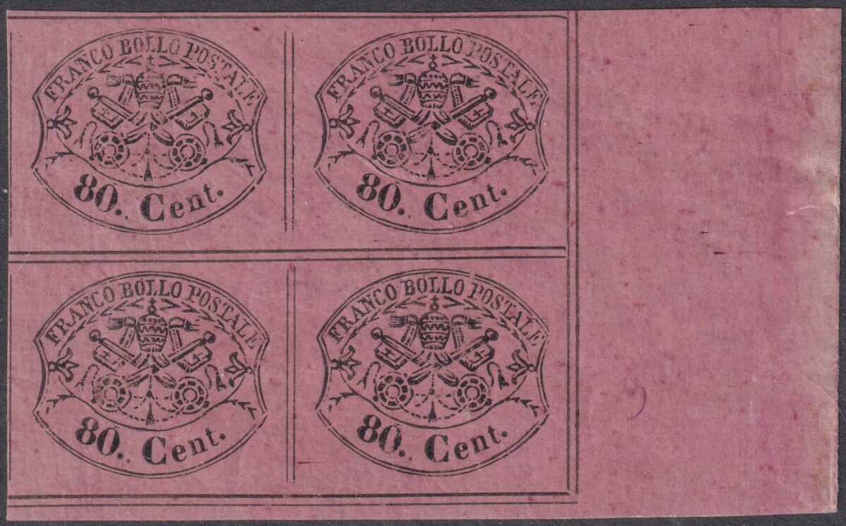 HomeFrancobolliAntichi StatiPontificioII Em. 80 c. verde giallo Quartina grandi margini Adf MNH**/MLH* f. Chiav. – Sassone n.20