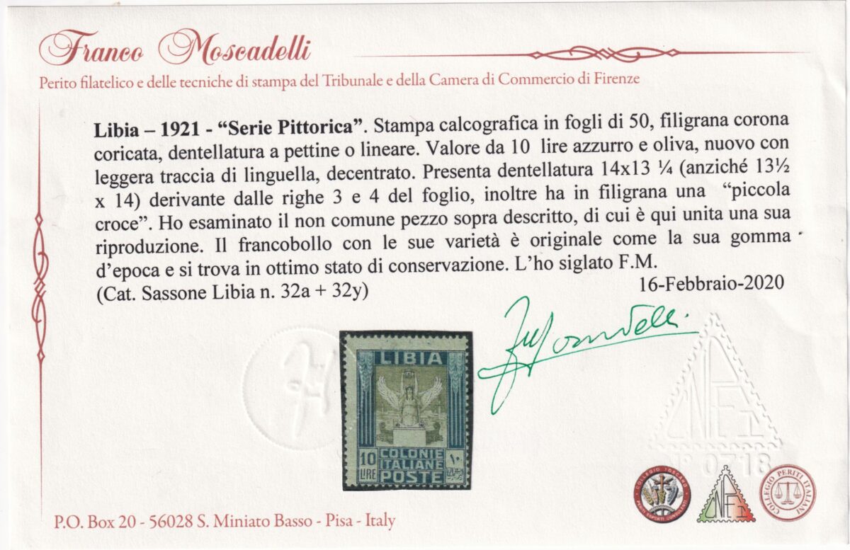 Libia 1921 10 l. azzurro e oliva Sass. 32a + 32y MH* Certificato Moscadelli Cv. 1800