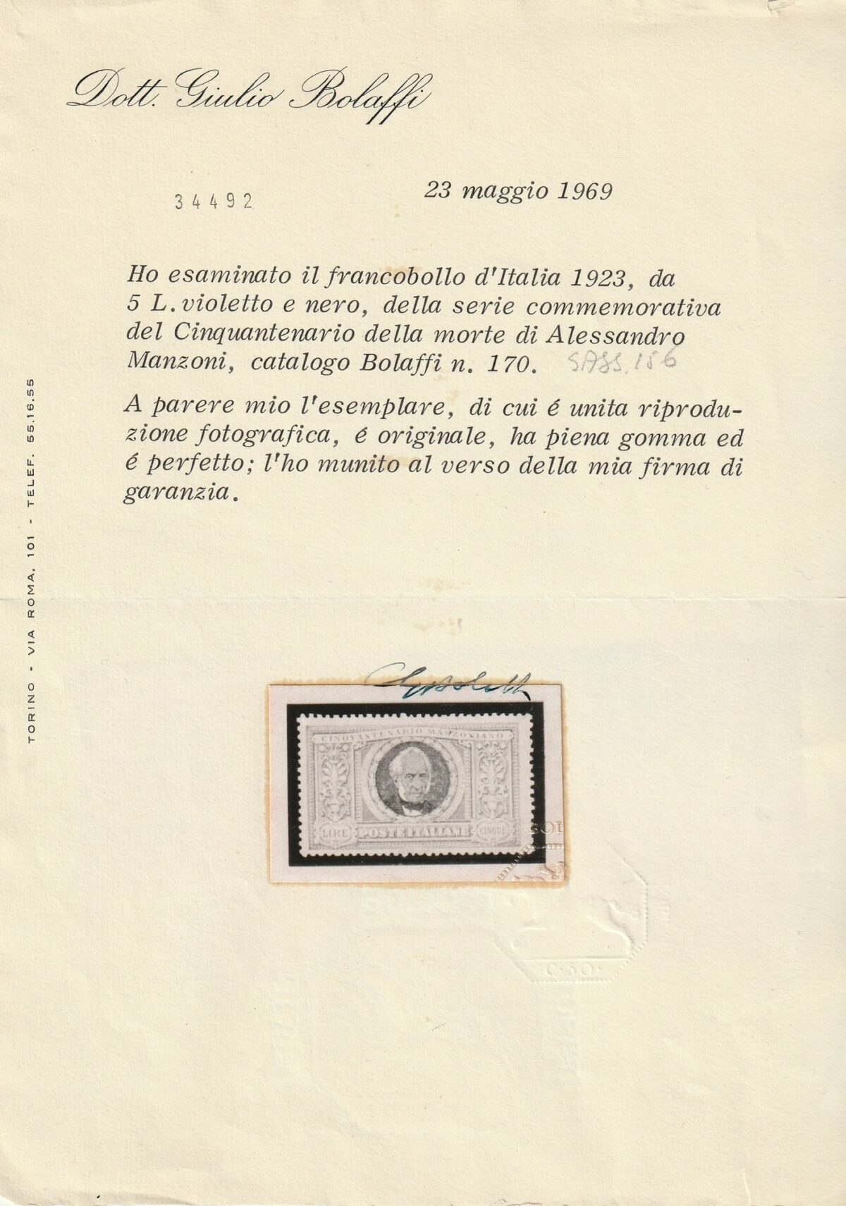 il 5 l. Certificato Giulio Bolaffi