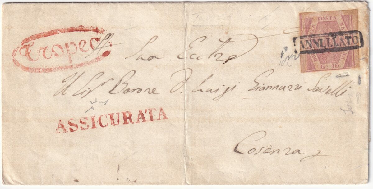 Napoli 10 gr. I Tav. rosa lillaceo isolato su assicurata da Tropea Pt.6 x Cosenza raro n.10a
