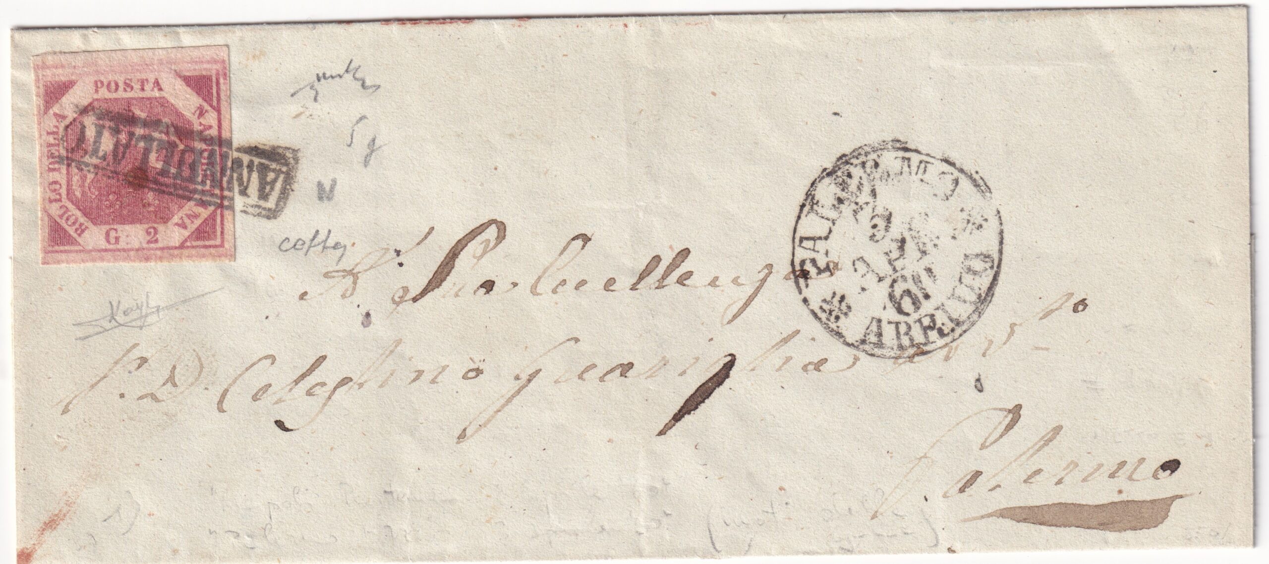 Napoli 2 gr. da Napoli a Palermo 4 Apr 1860 in Rivoluzione della Gancia Cert. Colla+f. Ray+Chiav raro