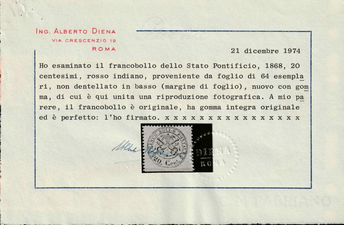 HomeFrancobolliAntichi StatiPontificioPontificio 1868 – III Em. il 20 cent rosso bruno indiano nuovo integro Bdf – Sassone N.27a