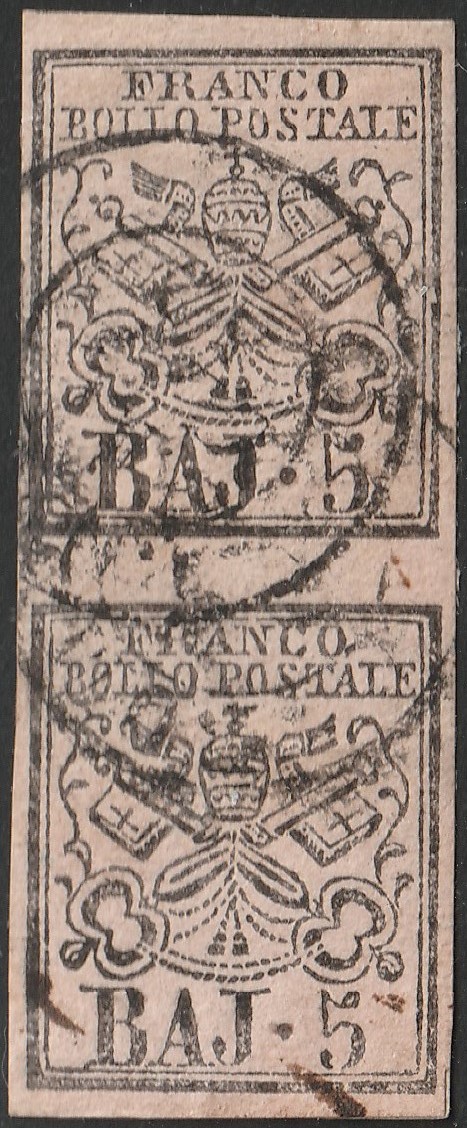 HomeFrancobolliAntichi StatiPontificioPontificio I Em., 5 bajocchi n.6 coppia verticale con INTERSPAZIO cv 350