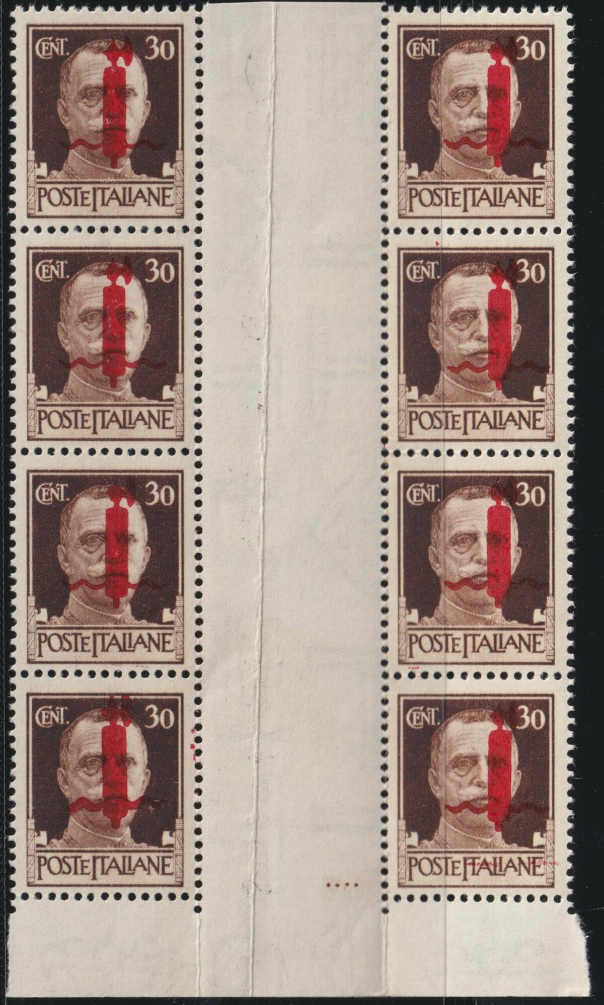 RSI 1944 30 c. blocco di 8 con interspazio Sass. 492 a sx + 492E a dx Rarissimo MNH**