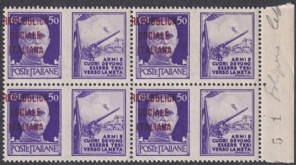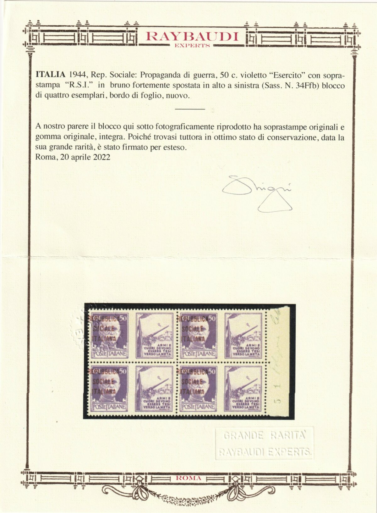 HomeFrancobolliRegnoRsi/Luogotenza/GnrRSI Pdg 50 c. Sovr. Bruna fortem. spostata in alto a sx Quartina Bdf integra Rarità Certificata – Sass. n.34Ffb Cv 20000