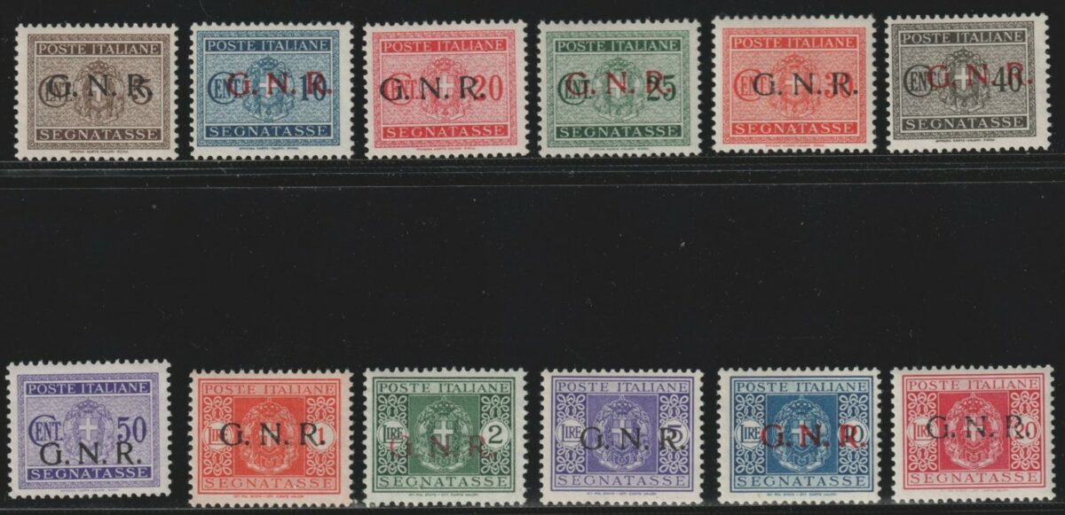 Serie di 12 valori Segnatasse G.N.R. Verona Sass. 47/43+55/59 MLH* firmati Carraro Cv 1000