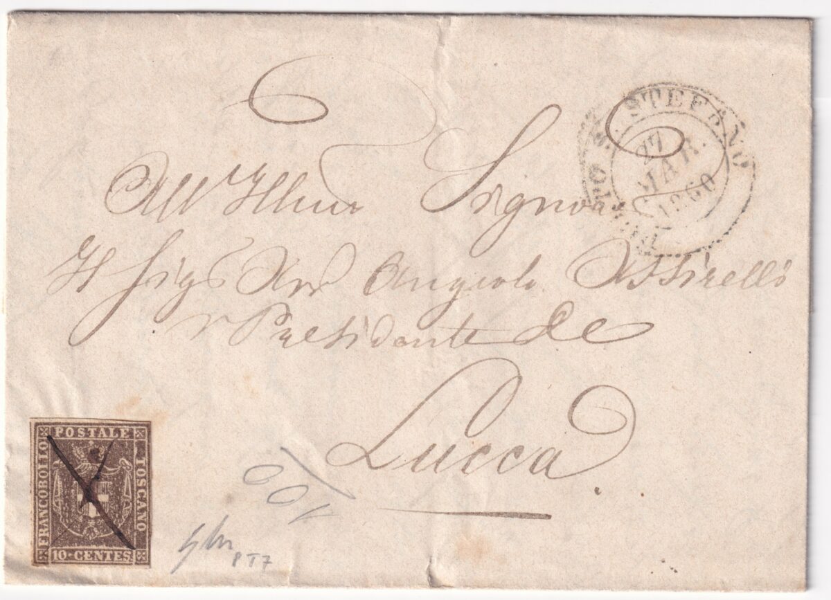 HomeStoria PostaleAntichi StatiToscana1860 27 Mar 10 c. Sass 19 su fresca lettera Porto S. Stafano a penna P7.7 x Lucca