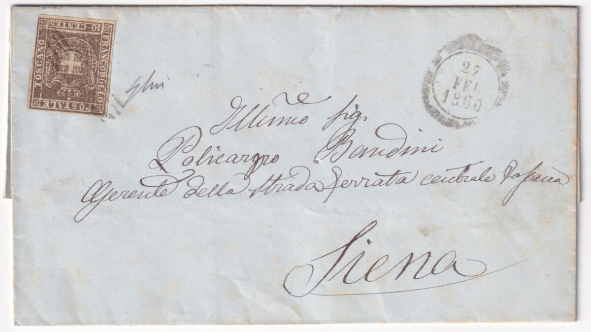 1860 23 Feb 10 c. Sass. 19 su fresca lettera da Grosseto sbarre sottili 6×30 Non Quotato x Siena Rara