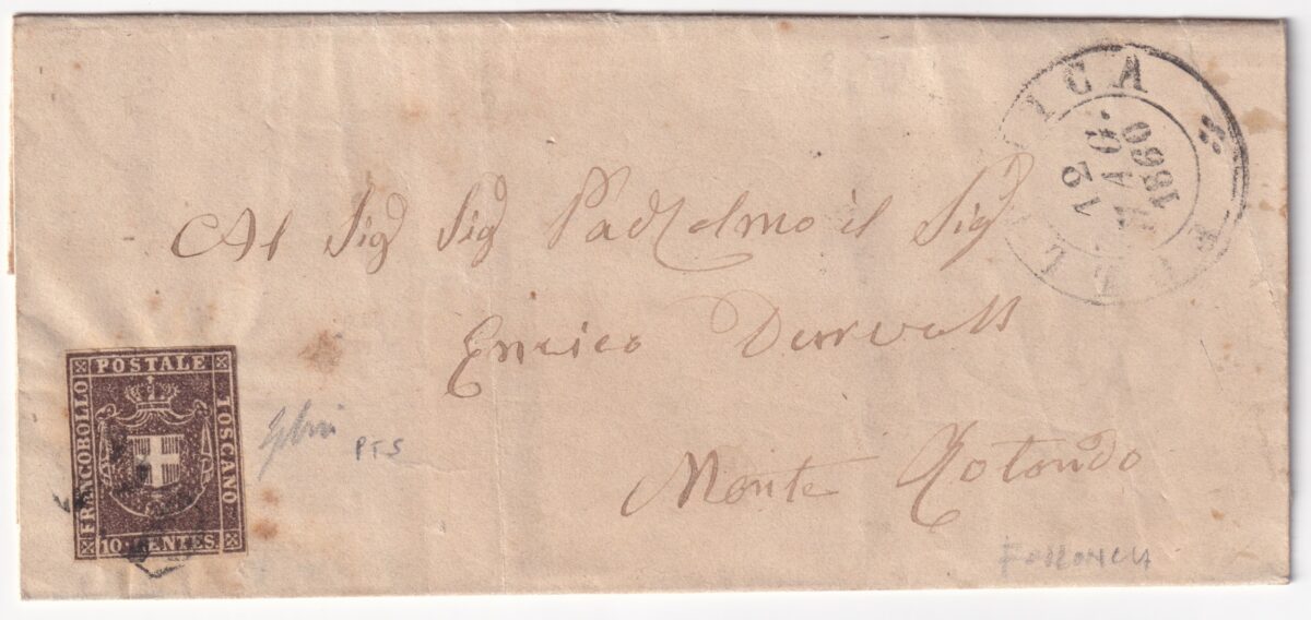 HomeStoria PostaleAntichi StatiToscana1860 12 Mag 10 c. Sass 19 su lettera da Follonica PD Pt.5 x Monterotondo