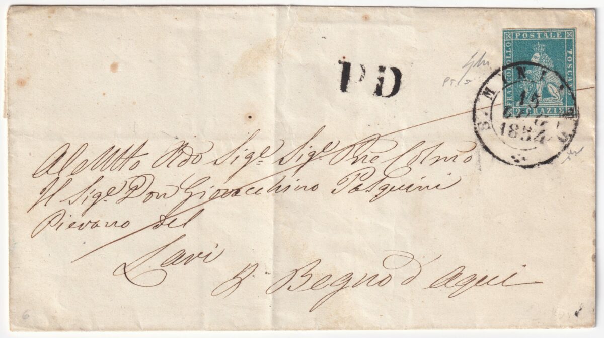 1854 15 Lug 2 cr Sass 5 su sovracoperta da S.Miniato Pt.5 x Bagno d’Acqui f.Chiav